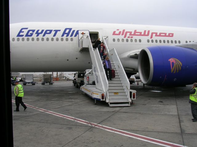 They noted several other passengers on the flight who were with OAT and probably going with us to Jordan. Our flight landed at 12 Noon and we deplaned, got on the last bus to the terminal - us, an Egypt family, and another American. We did have to walk through a slight drizzle from the aircraft (Boeing 777) and the bus.