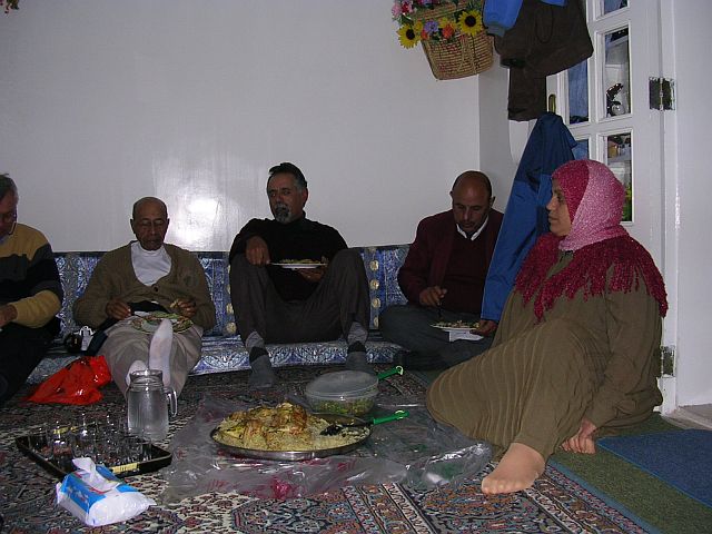 We all sat on cushions on the floor and were served plates of steaming hot rice, chicken, and vegetables. Our meal was concluded with hot sweet Jordanian tea as well as a fresh banana and oranges. We were shown the family's apartment which was spacious with 3 bedrooms very little furniture and mats for beds. The kitchen was a one person affair with the refrigerator was in the entrance way.
